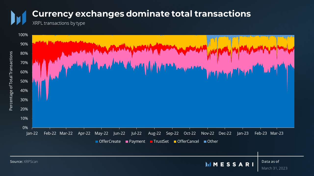 The dominance of transaction types varied, with OfferCreate holding the highest dominance at 65%, followed by Payment, OfferCancel, and TrustSet with dominances of 19%, 11%, and 3%, respectively. Notably, The OfferCreate transaction type primarily drove the increase in total daily transactions.